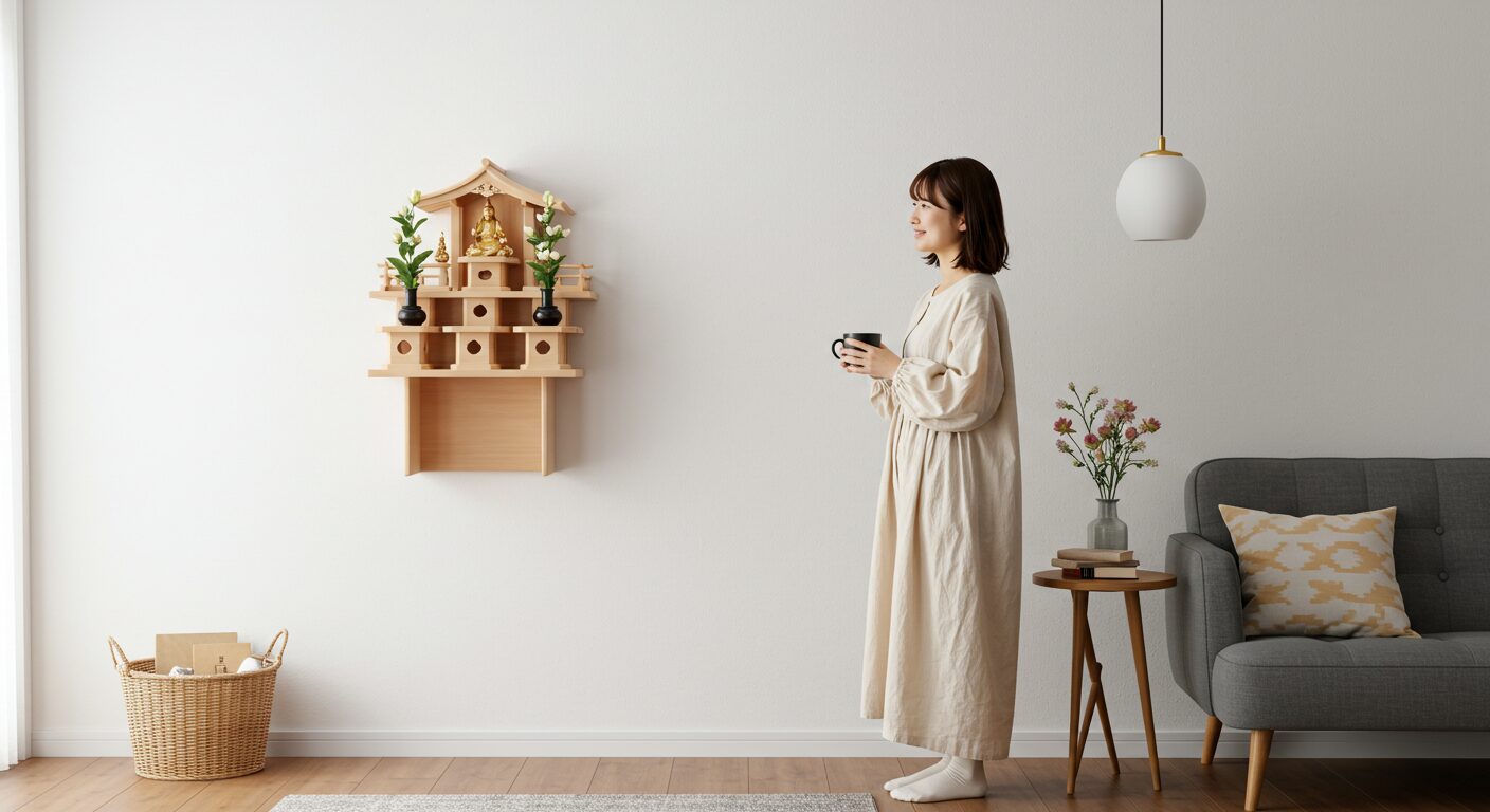 壁に穴を開けられない場合の、最高のアイデアがこれ。大切なのは「ここから上は神様の場所ですよ」と、他と区別する「設え(しつらえ)」の心。お気に入りの布を一枚敷くだけで、そこはもう立派な聖域になるんだ。