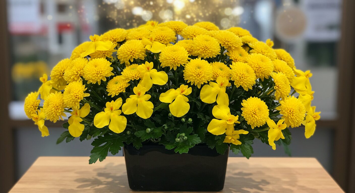 • 黄色の菊(スプレーマムなど):菊は日本の国花でもあって、格式高い花。特に「西に黄色で金運アップ」って言うように、黄菊は金運の象徴なんだ。