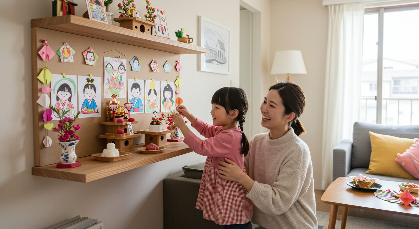 まずは、どこにお祝いコーナーを作るか決めよう。家族がいつも集まるリビングの棚の上や、子供部屋のカラーボックスの一角、玄関のカウンターでも素敵だね。大切なのは、子供の目線よりも高い、きれいな場所を選ぶこと。「これから神様に来てもらう場所だから、ピカピカにしようね」って、子供と一緒にお掃除するところから始めよう。