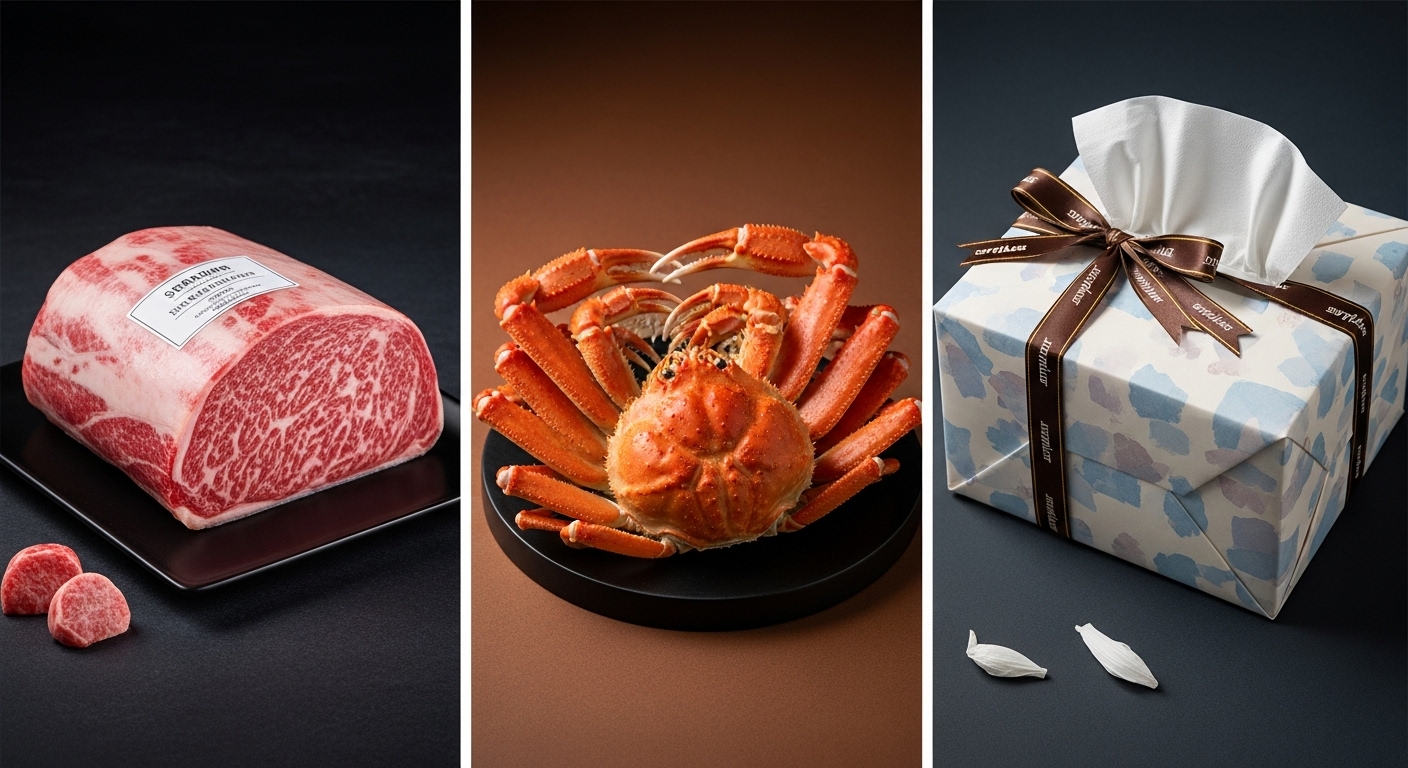 豪華な肉、カニ、山積みのティッシュペーパーの3つの返礼品が並んでいる画像