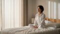 悪夢から解放され、北の方角を向いたベッドでぐっすり眠って、スッキリとした朝を迎えた若い日本人女性。窓から差し込む朝日で部屋が明るく照らされており、彼女はベッドの上で気持ちよさそうに伸びをしている。表情は晴れやかで、心からの安堵感と幸福感が伝わってくる。全体的にクリーンでポジティブな雰囲気 神棚
