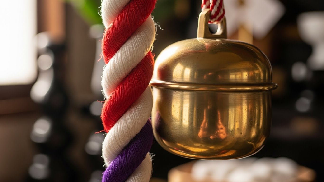 神棚にある丸い鈴は「本坪鈴(ほんつぼすず)」、そしてそこに繋がっている太い紐は「鈴紐(すずひも)」や「鈴緒(すずお)」と呼ばれます。これらには、古くから「邪気を払い、清らかな状態で神様に向き合う」という意味が込められています。