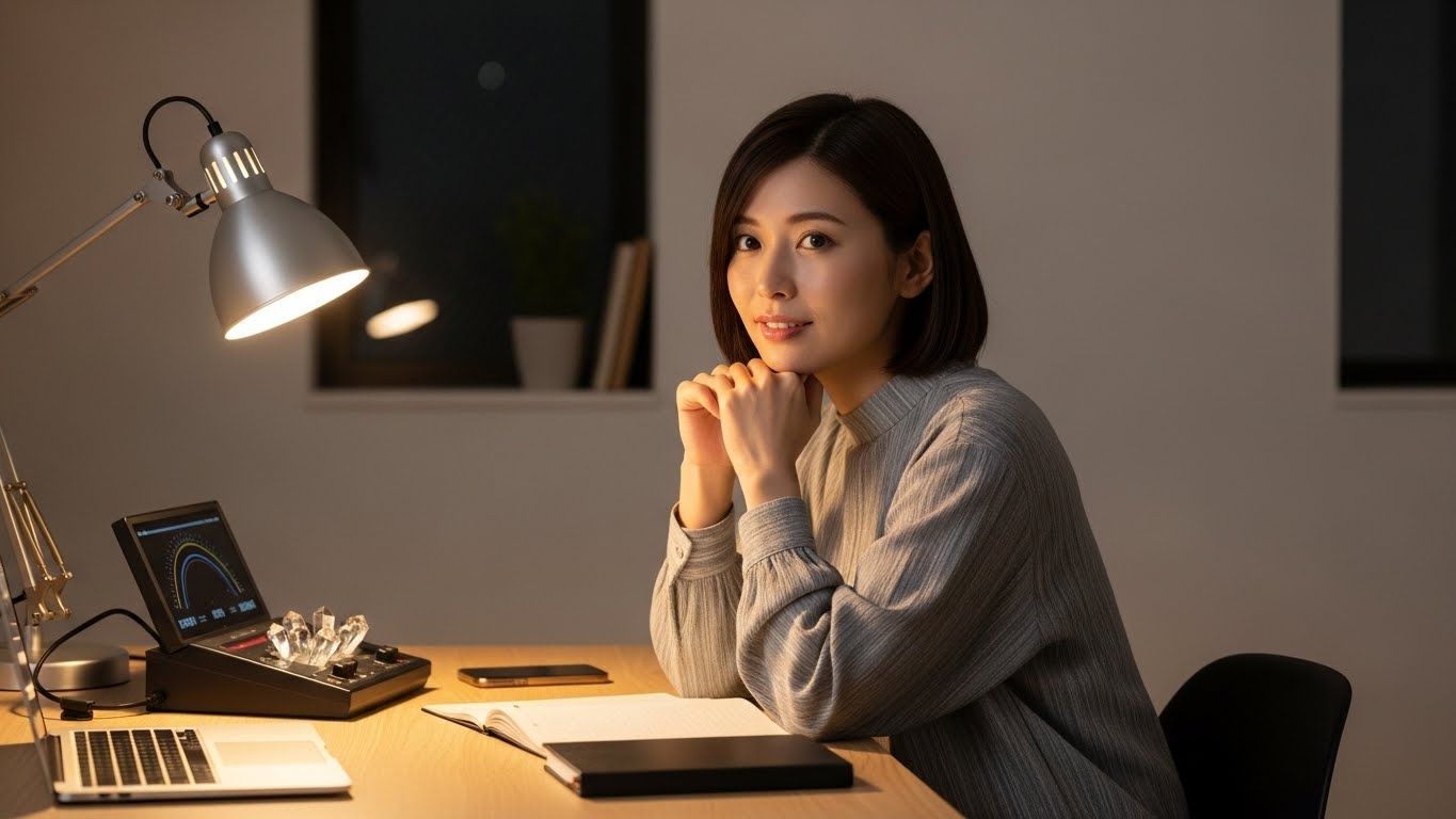 デスクに置かれたクリスタルチューナーを見つめる女性