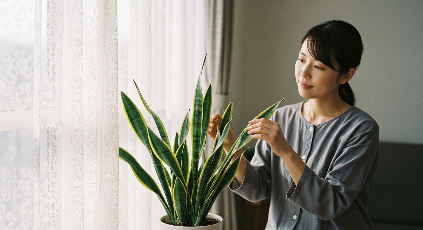 植え替えを終えたサンスベリアは、一回りスリムになり、葉と葉の間に適度な隙間ができました。元の場所に戻すと、そこだけ「風の通り道」ができたように見えます。