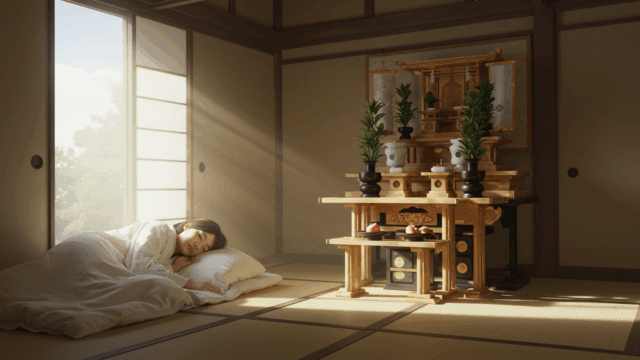 神棚 【科学的に解説】西枕で老けるってホント?風水のウワサと睡眠科学で導く、本当の美肌習慣 神棚の前で寝るのは大丈夫?その影響やスピリチュアルな意味を解説。「良くない」と言われる理由と、運気ダウンを防ぐための開運法・浄化術、護符やパワーストーンなどの対策アイテムも紹介。もう不安にならないための知識と実践法。 2025.05.04 神棚