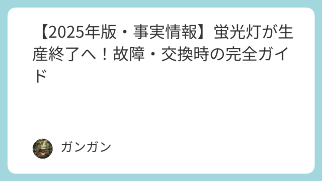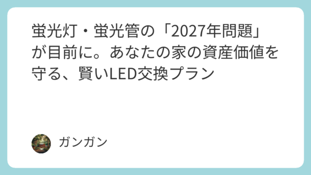 生活 蛍光灯・蛍光管の「2027年問題」が目前に。あなたの家の資産価値を守る、賢いLED交換プラン ご自宅の「蛍光灯」、実はタイムリミットが迫っています「蛍光管が切れたら、また新しいものを買ってくればいい」そんな当たり前だった常識が、もうすぐ通用しなくなる未来がすぐそこまで迫っていることをご存知ですか?実は、私たちの暮らしに長く貢献してき... 2025.10.08 生活
