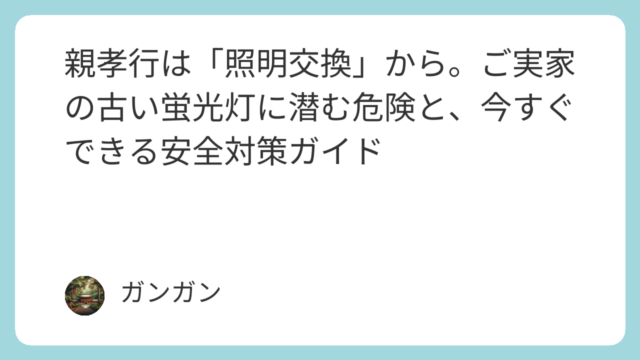 生活 親孝行は「照明交換」から。ご実家の古い蛍光灯に潜む危険と、今すぐできる安全対策ガイド あなたの実家の照明、何年も変わっていないのでは?「そういえば、実家のあの部屋の照明、子どもの頃からずっと同じだな…」ふと、そう感じたことはありませんか?その"変わらない"お馴染みの蛍光灯が、実は火災などの思わぬ危険を招く原因になり得ること、... 2025.10.08 生活